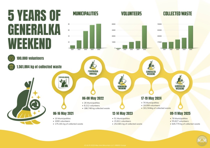 A record participation of 55,627 volunteers and more than 645 thousand kilograms of waste collected on the territory of all municipalities in the country – these are the results of this year’s, fifth anniversary environmental action “Generalka Weekend”, which took place from May 9 to 11. The three-day action involved more than 600 government and non-governmental organizations and institutions, with logistical and partner support from a large number of companies, united in a common goal for a cleaner and healthier Macedonia.